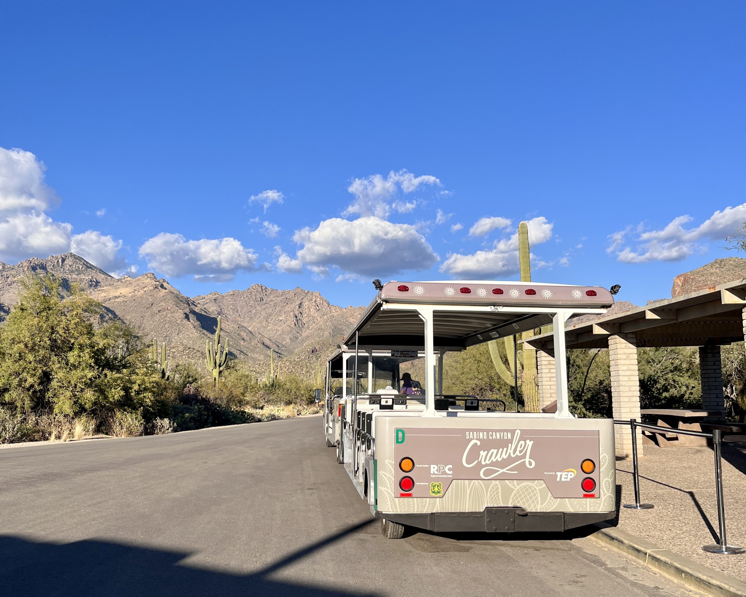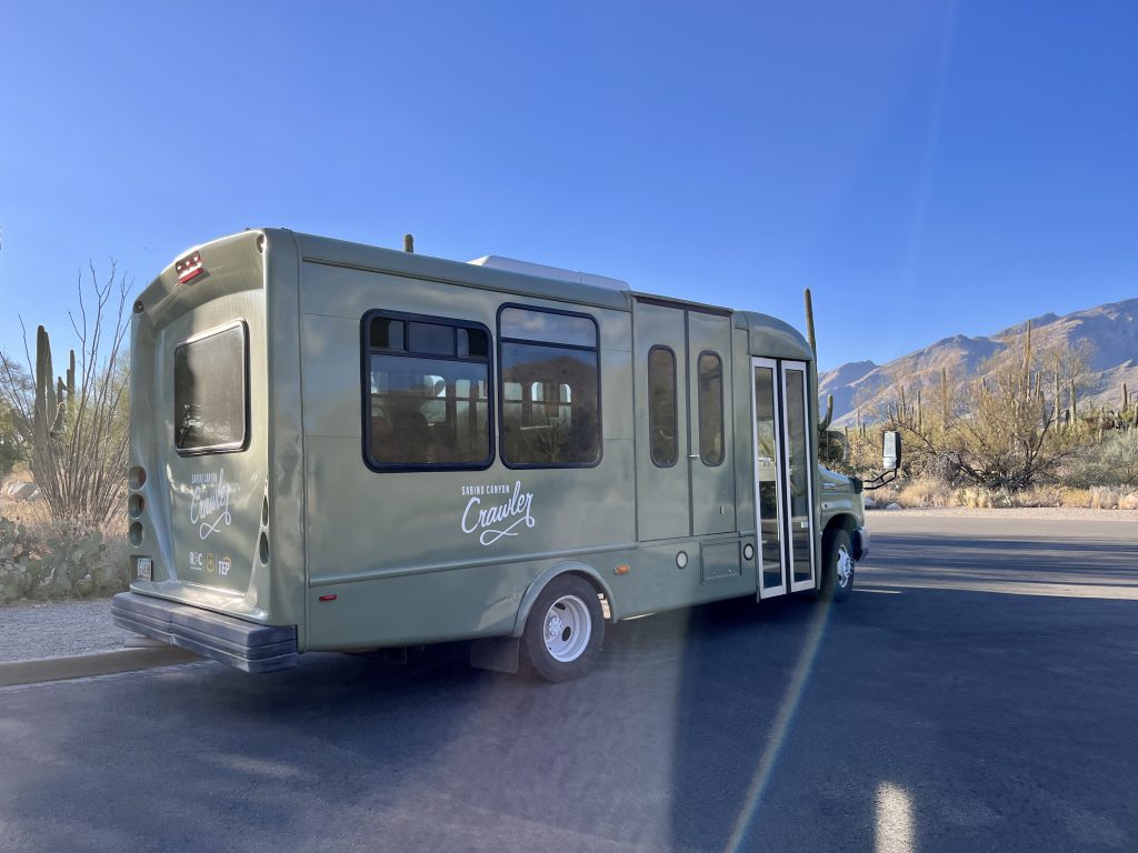 The Sabino Canyon Crawler operates electric shuttle services 359 days a year. (Closed Thanksgiving, Christmas, New Year’s Day, and 3 days for maintenance.) A narrated, one-hour (7.4-mile roundtrip) tour to the upper end of Sabino Canyon describes the geologic and cultural history of the canyon. Free earbuds are provided. Departures are from 9 AM to 4 PM. Check Crawler website for times. During periods of high water, an alternative tour is provided.