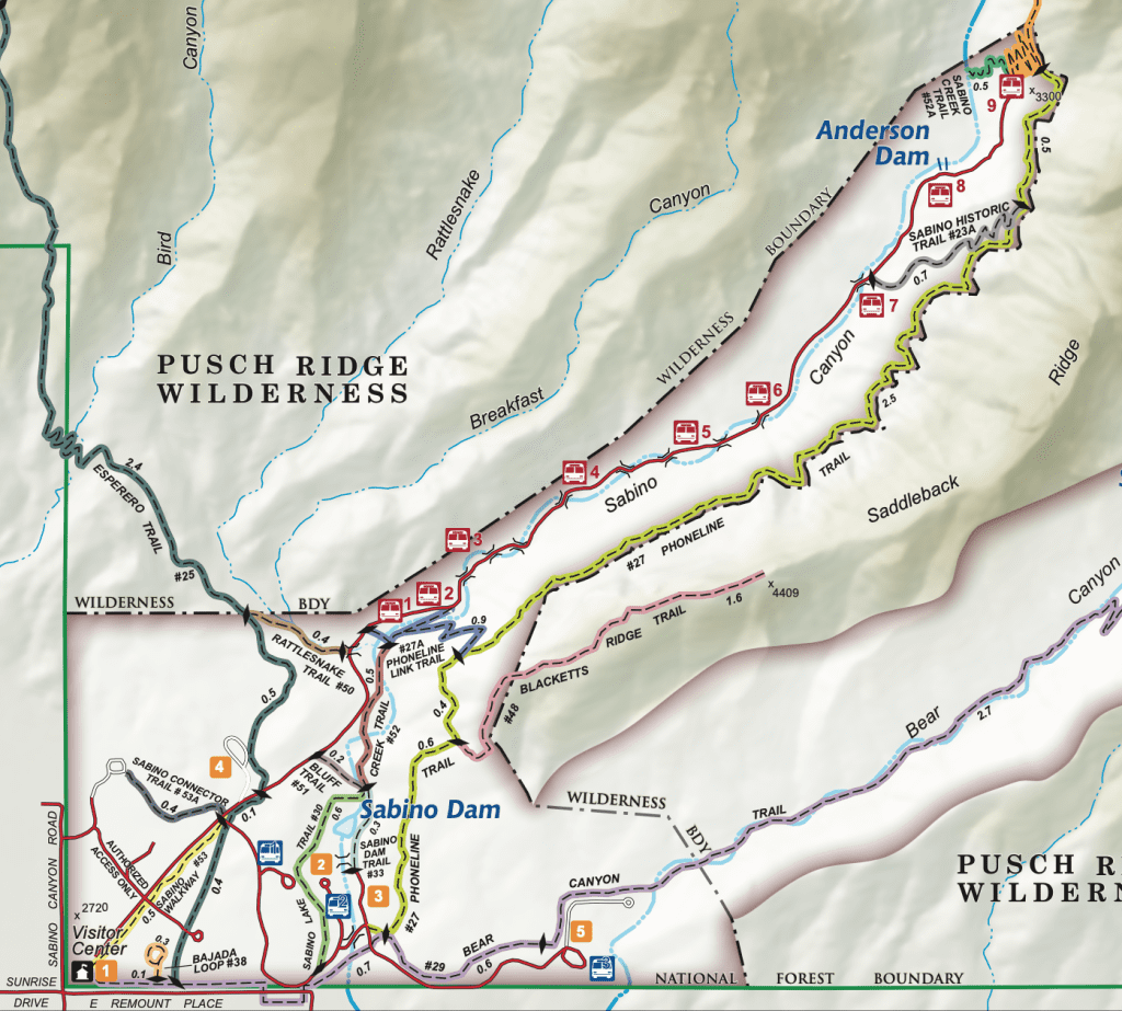 The Bear Canyon Crawler provides access (1.9 miles one-way) to the Seven Falls Trailhead and Lower Sabino Canyon. Bear Canyon service is not narrated. Departures typically leave hourly from 9:15 AM to 4:15 PM. Check Crawler website for times.